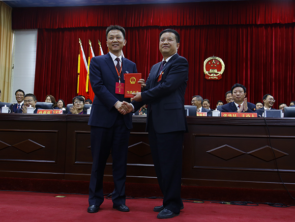 大会上,张华昆宣布当选人名单并为新当选的县人大常委会主任袁崇彦颁发当选证书。县人大常委会主任袁崇彦为新当选的县人民政府县长陆颖,县第十六届人大常委会副主任,县人民政府副县长,县人民法院院长、检察院检察长,县第十六届人大常委会委员颁发了当选证书。参会代表以热烈的掌声表示祝贺;新当选的国家机关领导人员面对国旗,向宪法庄严宣誓。